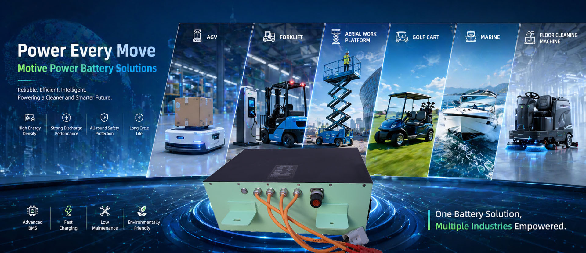 From AGVs and forklifts to aerial platforms, marine equipment, and cleaning machines, RICHYE delivers reliable motive power battery solutions for diverse industrial needs. Backed by advanced battery technology and application-focused design, our systems are built for stable performance, lower maintenance, and long-lasting efficiency.